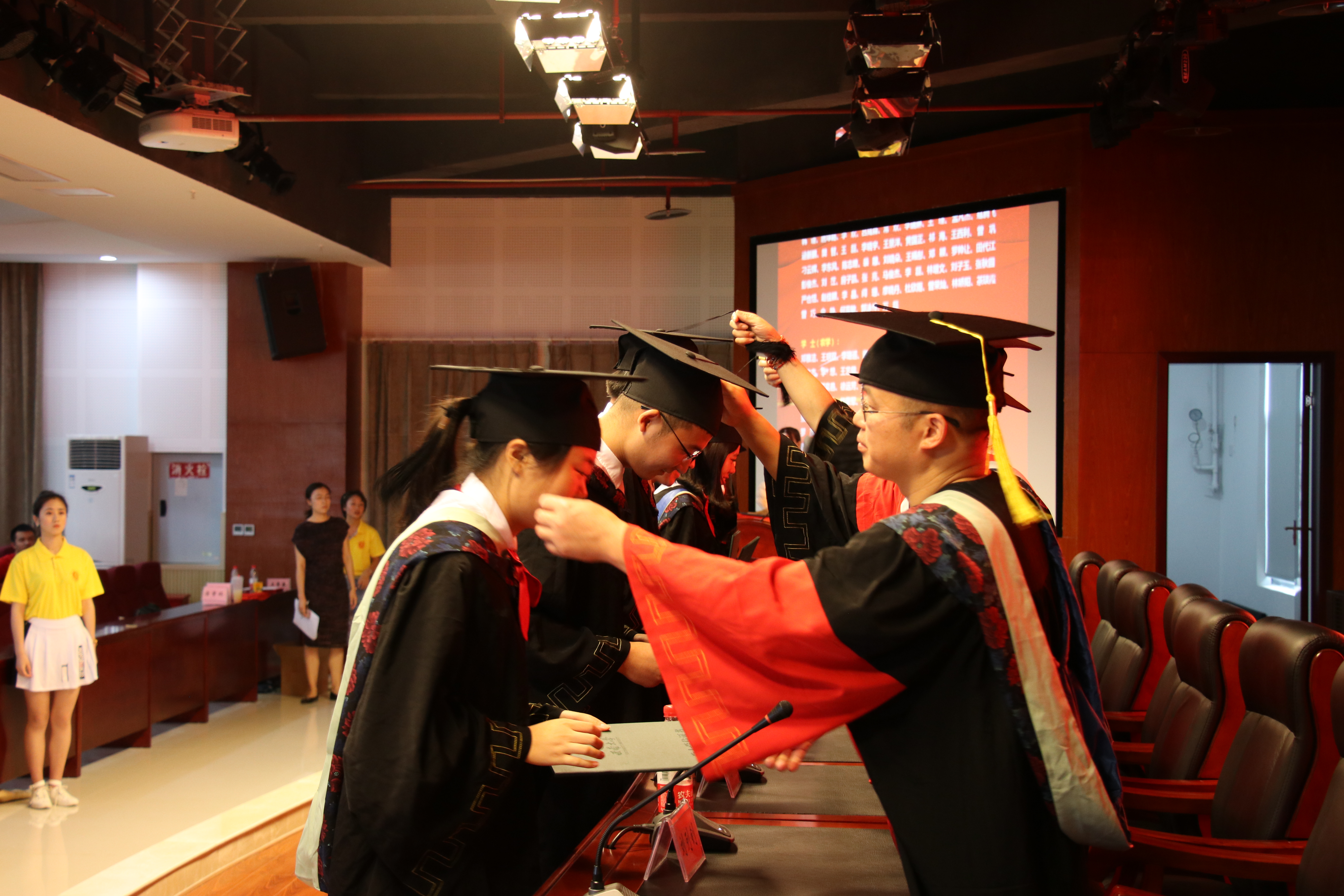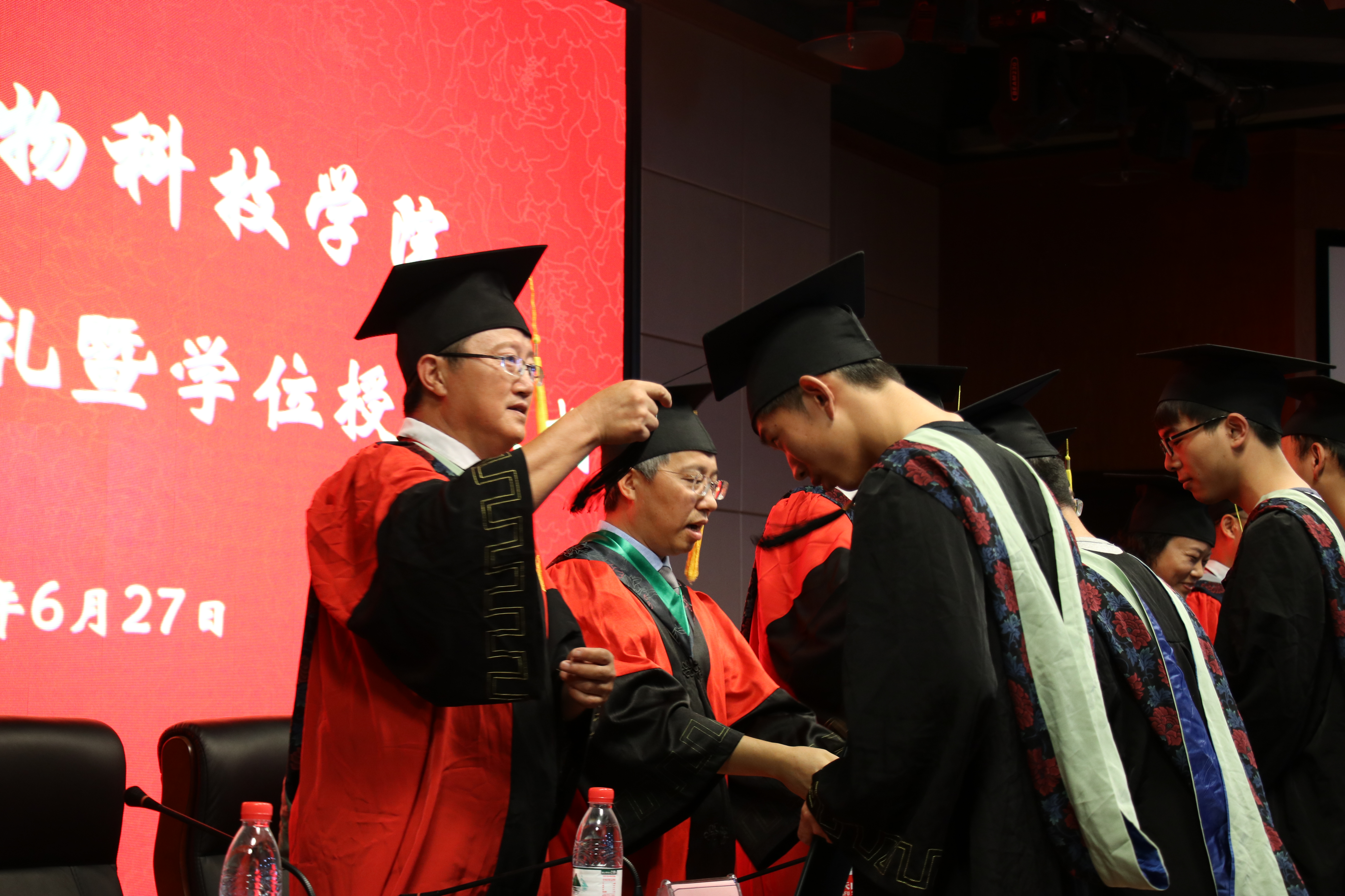 第二阶段学位授予仪式由唐章林副院长主持。周常勇副校长和院学术委员会成员为学位获得者逐一授位并拨穗。