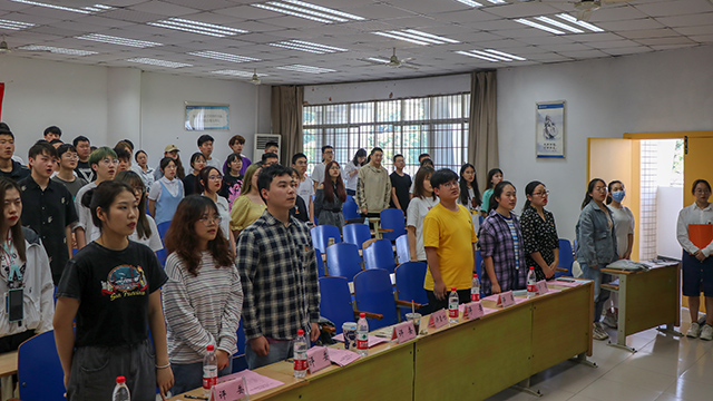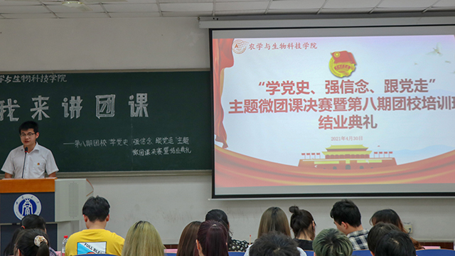 团委于2021年4月30日下午2:00在32教学楼514教室举办以“学党史,强信念,跟党走”为主题的 “我来讲团课”主题微团课比赛第八期团校暨结业典礼。团委书记兼2019级辅导员许莹竹老师、本科生四个党支部学生党员代表邓超、谢冰一、江青莲、张帅以及学生会执行主席李欣玥、学生会副主席王雪松出席并担任评委,本期团校全体学员到场观摩学习。