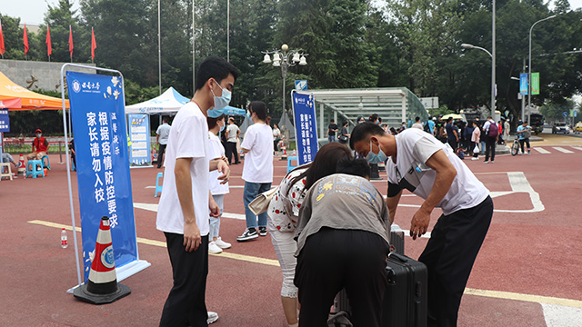早上7点,2号门口一片红色,红的是横幅,红的是志愿者鲜艳的衣服,更是朝阳下学长学姐们的热情与温暖。志愿者们有序的帮助新同学搬运行李,指示方向。进入校门后,校门口防疫登记志愿者为每一位新生检查相关信息。学校安保人员及志愿者引导学生进行防疫登记并保持间距入校,对每一个入校人员进行登记测温,全力保证师生健康安全。志愿者们提着沉重的行李,推着箱子,同时细心的回答学弟学妹们的问题,介绍学校的布局。那一张张青春的面容,彰显着西大的朝气与蓬勃。一张张热情的笑脸,一句句亲切的问候,一项项贴心的服务,迎接着来自祖国各地的莘莘学子。不惧炎热的太阳,不辞辛劳地帮同学们把行李搬,让新同学切实感受到来着奈飞工厂