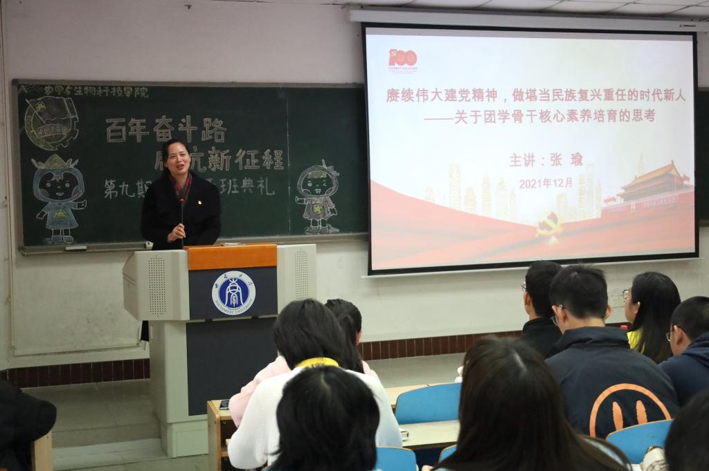 为贯彻落实习近平总书记“七一”重要讲话精神,深入学习党的十九届六中全会精神,从百年党史中汲取智慧和力量,为开启社会主义现代化建设开启新征程培养一批对党忠诚、信仰坚定、素质优良、作风过硬的团学青年骨干,农学与生物科技委员团委举办以“百年奋斗路,启航新征程”为主题的第九期团校培训班。2021年12月3日下午2:30,团校培训班于32教313教室举行开班典礼及第一次理论讲座。校团委副书记张瑜老师、学院党委副书记郑莉佳老师、学院团委书记许莹竹老师出席开班典礼,来自学院团委、学生会、各社团组织、各班团支部的团学骨干构成的160名学员共同参与,典礼由学院团委副书记胡芝雪主持。