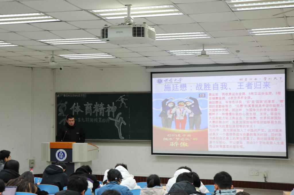 奥运健儿的奋斗故事,迎接2022年北京冬奥会,2021年12月26日19:00,学院第九期团校培训班32教313教室开展第四次专题讲座,邀请到西南体育学院党委专职组织员李进老师为全体团校成员讲授奥运精神和拼搏人生。