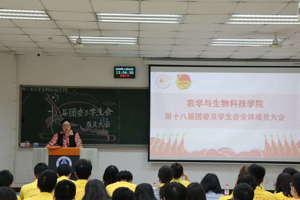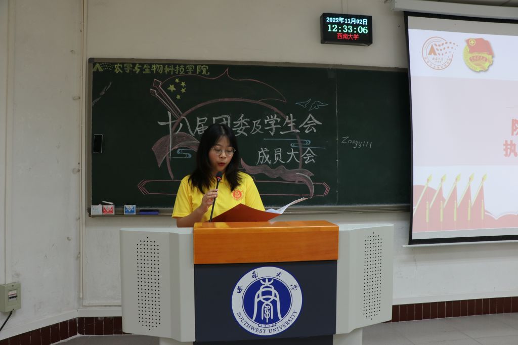 校学生会校主席团成员邓泽奕同学发言,他号召所有学生骨干应践行“全新全意服务同学”的宗旨,积极开展各项工作,同时通过强化政治引领,践行服务宗旨,勇于自我革命,切实塑造起新时代学生会清新阳光的形象。他强调,正值全校上下深入学习贯彻党的二十大精神之际,作为学生骨干,也应发挥好桥梁作用,不断团结带领广大学子坚定不移做时代好青年。“参与多深,领悟多深,投入多少,收获多少”,邓泽奕同学以自己的座右铭,来激励广大农生学子要积极发挥模范作用,在自己的工作岗位上认真履职尽责。