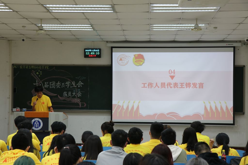 会议第四项,办公室工作人员王铧同学代表团委学生会新成员发言,他激昂地代表了加入团委及学生会团队喜悦与兴奋,、共同做好工作的信心与决心,并积极表态,谨记杰出校友直系学长袁隆平先生的寄语,践行学院“追梦求实”院训,做到脚踏实地干事,努拼搏向未来,在学生组织中积极服务同学、锻炼自我,书写多彩青春。