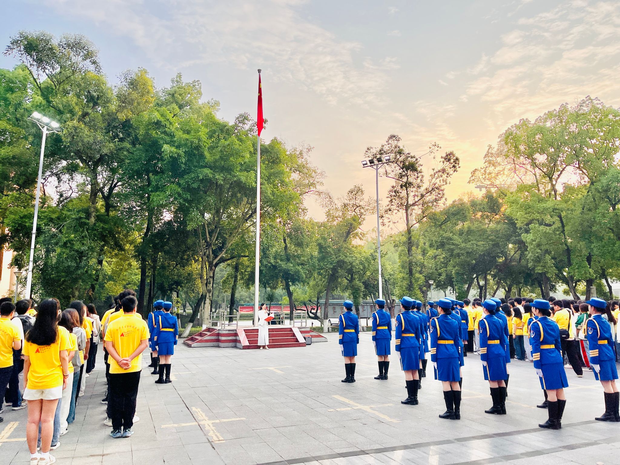女子国旗班迈着整齐有力的步伐,护送五星红旗正步走向升旗台。全体师生面向旗杆,身姿挺拔,庄严肃立。随着激昂的《义勇军进行曲》奏响,五星红旗在晨曦中冉冉升起,师生们齐声高唱国歌,目光坚定地注视着国旗,现场气氛庄重而肃穆。