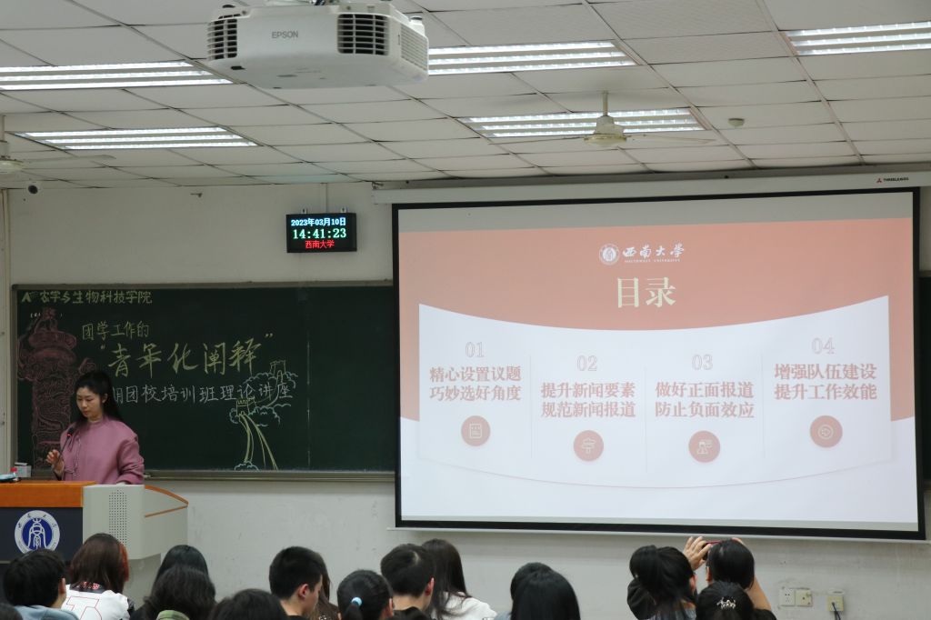 张老师启发大家要主动留意身边事物,发现宣传素材,拓展宣传工作思路,人人都可以做宣传员、小记者。在宣传工作中,要注重贴近时事热点、贴合平台属性、贴近师生生活,培养政治敏锐度,开展多样化阐释,提升内容的亲和力和感染力。在授课中,张老师从结构规范、内容规范、标题规范等就新闻写作的规范性展开详细讲解,并附以案例解读,深入浅出,让同学们更好的理解和掌握。她指出,新闻宣传也是可以精选策划的,大家也可以从受众的角度出发,主动策划青年学生喜闻乐见、愿意参加的活动,并通过宣传扩大影响力。她激励同学们多多挖掘学院特色资源和优势,多策划一些富有我们农科特色的品牌活动。