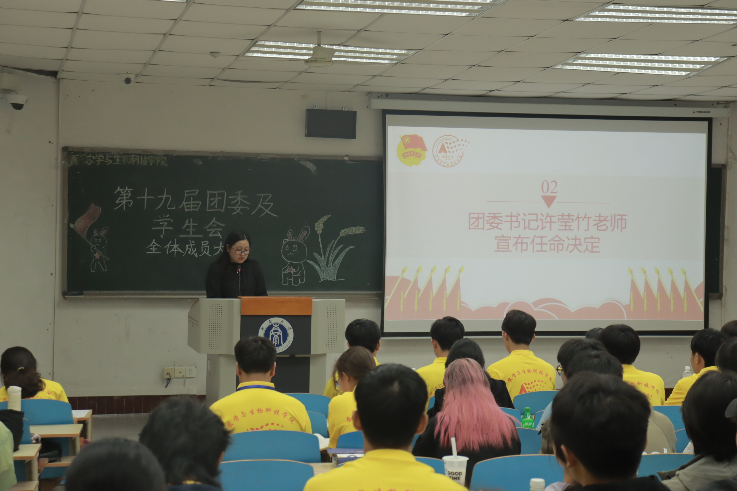 在庄重而悠扬的团歌声中,大会拉开帷幕。团委书记许莹竹老师宣读第十九届团委及学生会主要工作人员任命书和工作人员录用名单,许老师对第十九届团委及学生会寄予殷切期望,她希望同学们增强责任意识,深化各部门之间的合作交流,牢记服务宗旨,杜绝“事不关己,高高挂起”、“踢皮球”等不良风气,搭建好同学与学院沟通的桥梁,在学生工作中锤炼过硬本领、增长智慧才干。
