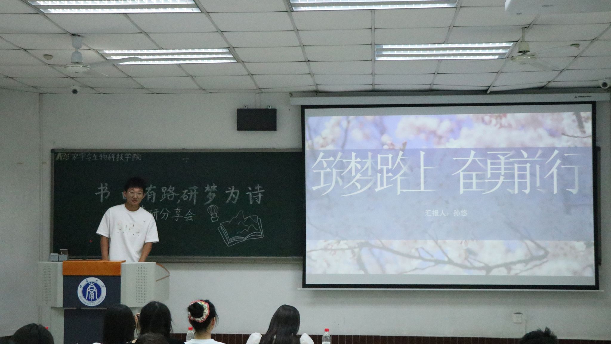 最后带来分享的是已成功考研至南方科技大学生物与医药专业的孙悠同学,他主要向大家讲述在调剂和复试过程中的体会。“遇到调剂不要担心,要鼓起勇气通过邮件等方式联系老师,通常情况下,都会收到老师的回复。”他还提到,在面试中自己的科研经历以及获奖证书给老师留下了深刻印象,他用亲身经历告诉同学们科研成果在考研复试过程中的重要性。最后,他寄语同学们,每一滴汗水都是向着光明未来迈进的见证,每一次挫败后的站起都让自己的心灵更加坚强。