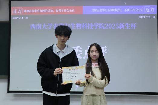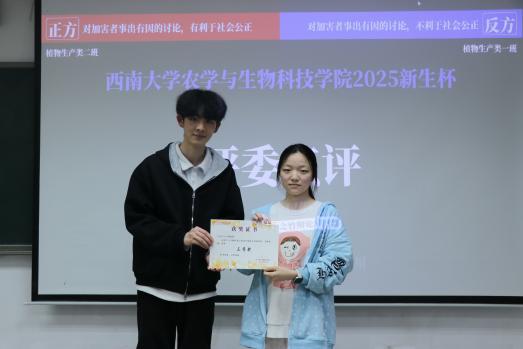 最终,2025级植物生产类1班以8:7的比分险胜,荣获本次新生辩论赛冠军,2025级植物生产类2班获二等奖,2025级植物科学与技术2班获三等奖,2025级生物育种科学2班获优秀奖。