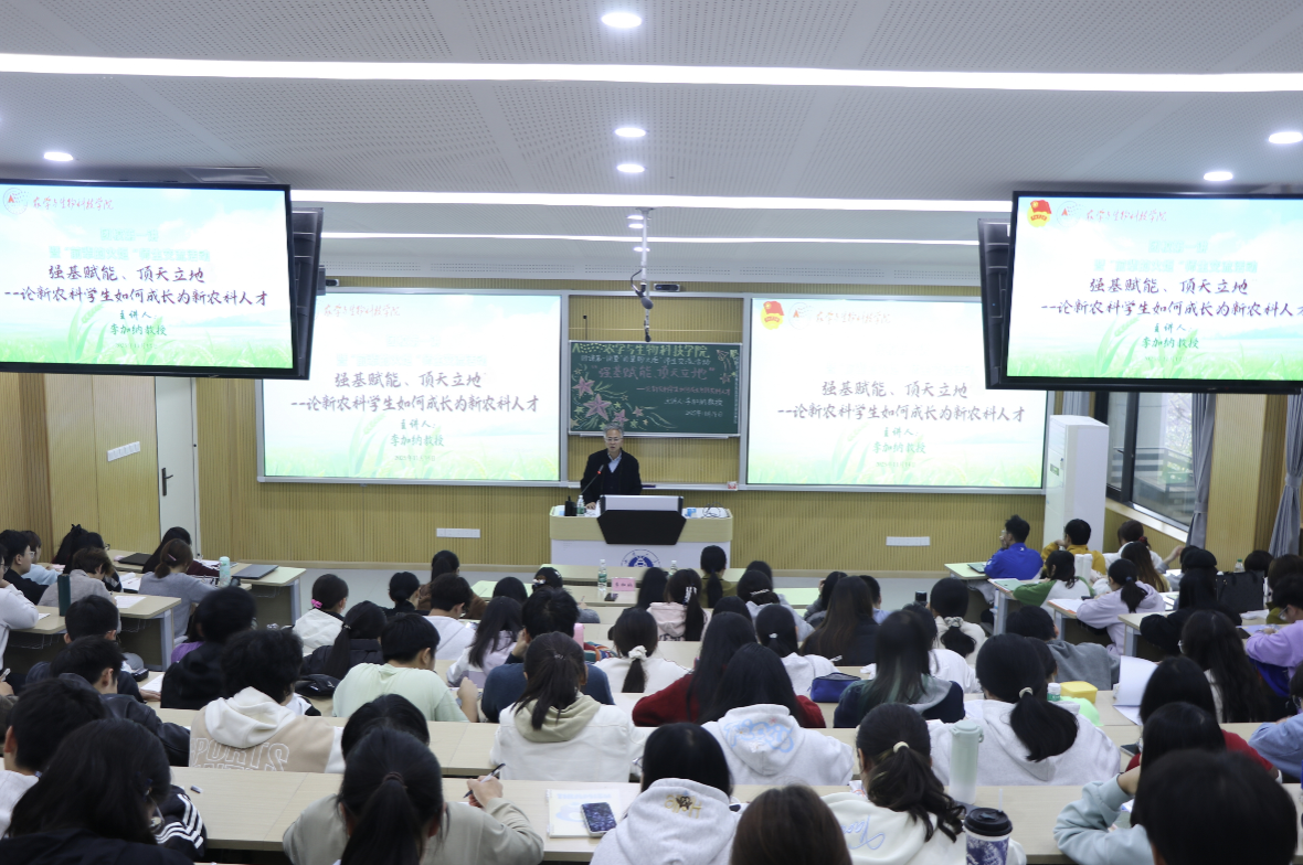 李加纳教授以“强基赋能,顶天立地——论新农科学生如何成长为新农科人才”为题给同学们做讲座。他首先带领同学们一起学习了习近平总书记给中国农业大学全体师生的回信,强调“知农爱农”的切实要求,鼓励新农科学生要努力成长为新农科人才为建设农业强国、推进中国式现代化做出新贡献。