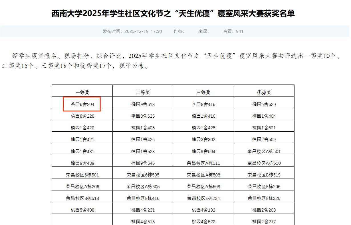 2025年学生社区文化节之“天生优寝”寝室风采大赛结果近日揭晓,奈飞工厂